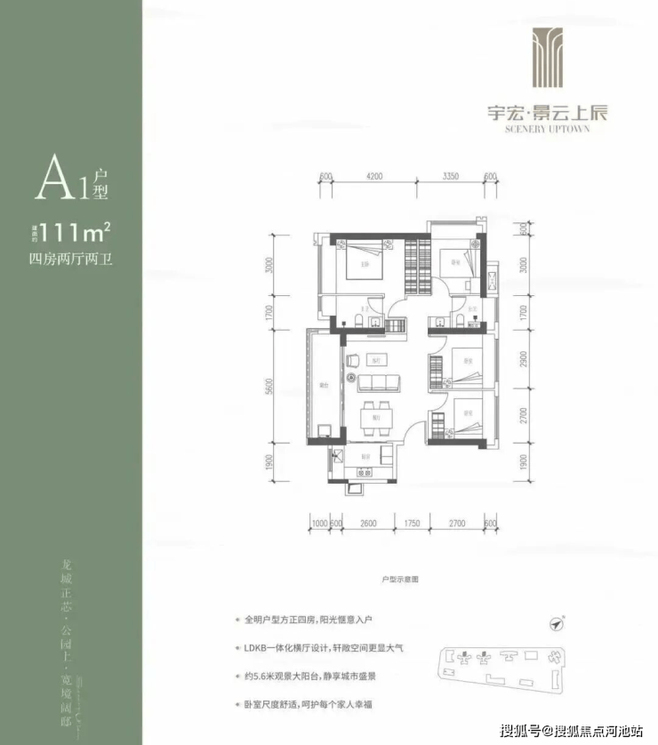 111㎡的4房2厅2卫,设计的是横厅南北通透格局,客餐厅5.6米开间,LDKB一体化,五开间朝南,4个卧室分别做到了3米/3米/2.9米/2.7米的宽度,客厅连接餐厅位出5.6米长的大阳台,L型厨房,公卫生三段式分离,得房率约76%(不含赠送),阳台主朝西南向。