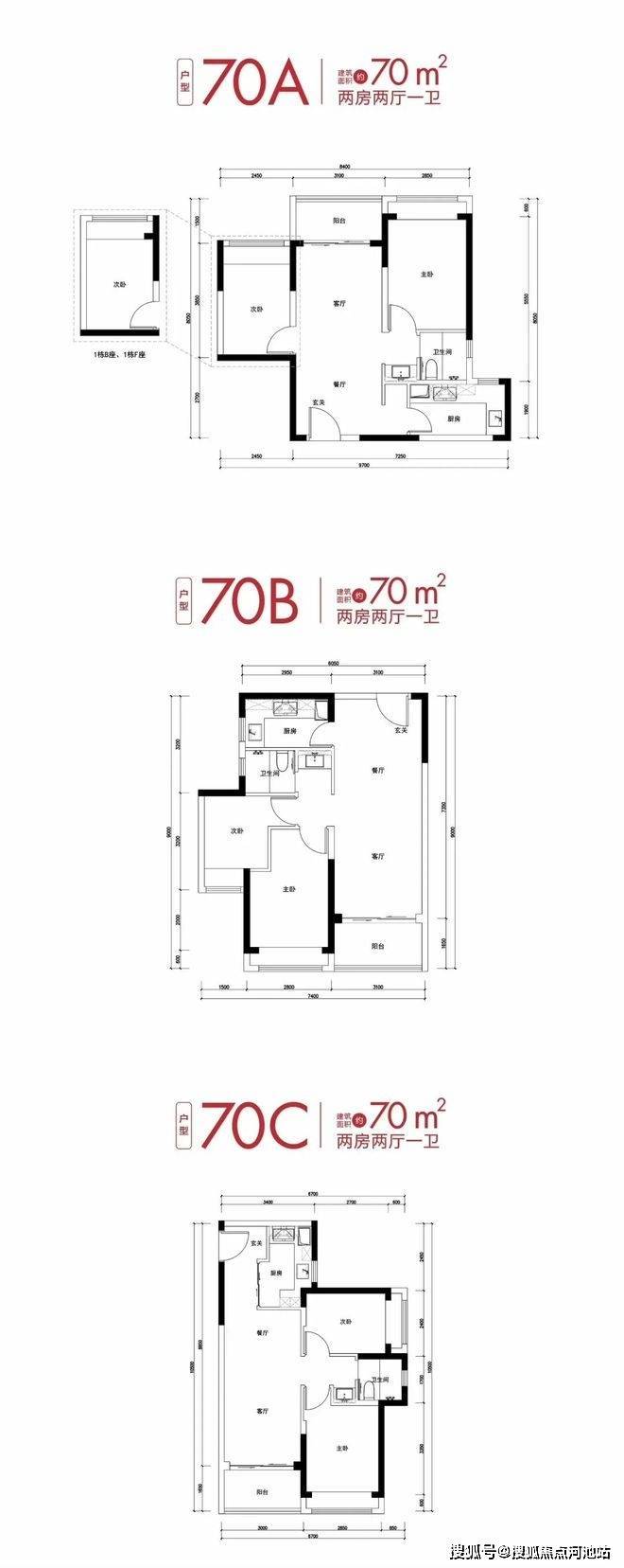 户型:建面约70㎡两房、建面约90㎡三房两卫