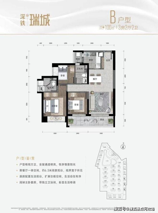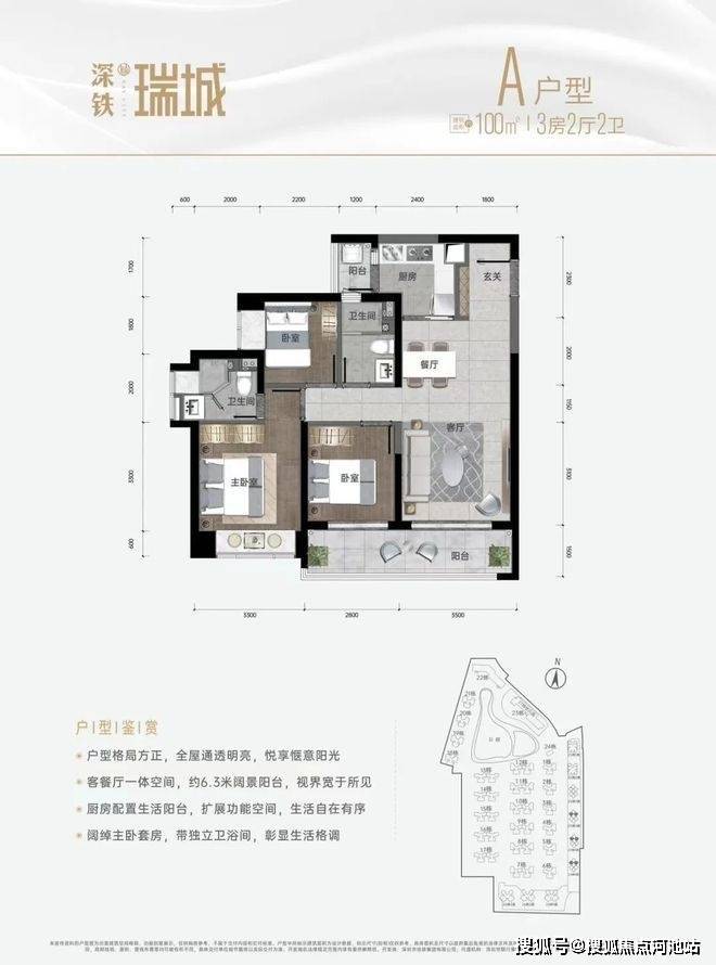 深铁瑞城在售户型以建面约96-100㎡的三房为主,包含4个户型,全明采光,竖厅南北通透,6.3米观景阳台,主卧套房设计,兼顾舒适性与实用性。