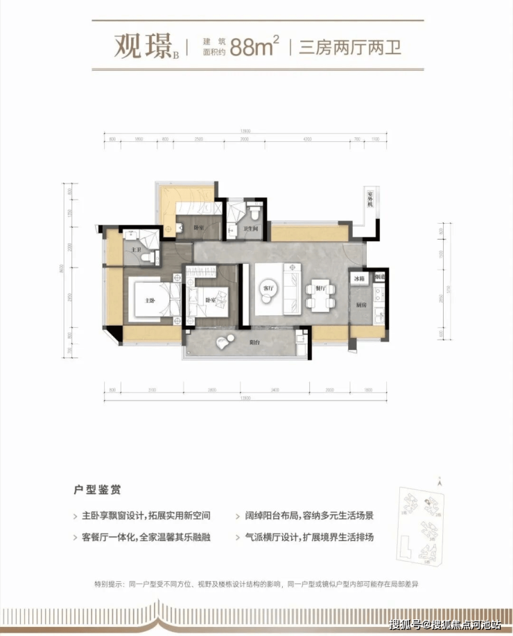 在深圳,将80平米做成功能齐全的三房两卫已属佳作。中建观玥通过经典的竖厅和LDKB一体化设计,在有限面积内实现了三个方正卧室、明厨明卫。主卧采用双飘窗设计,拓展了空间感。该户型是总价控制在300万级别的“上车”利器。