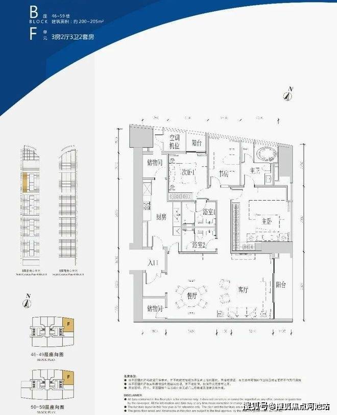 约205-210 ㎡ 3房2厅4卫3套房(双阳台设计,可览香蜜公园、塘朗山景观;全套房设计,私密性佳;双储物间设计,享富足收纳空间)