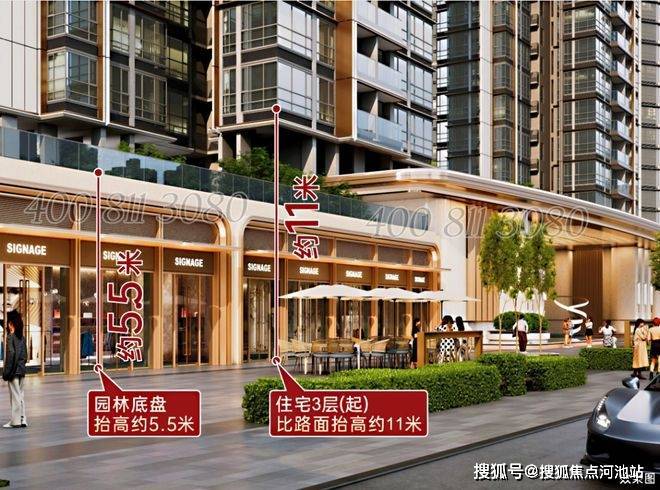 社区园林整体抬升约 5.5 米,住宅自3楼起,标高较外部地面高出约11米。