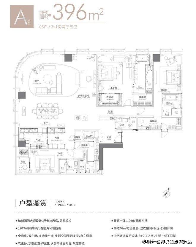 A户型约396㎡为3+1房2厅2厨5卫,西北朝向,全套房双主卧设计,次卧带阳台。