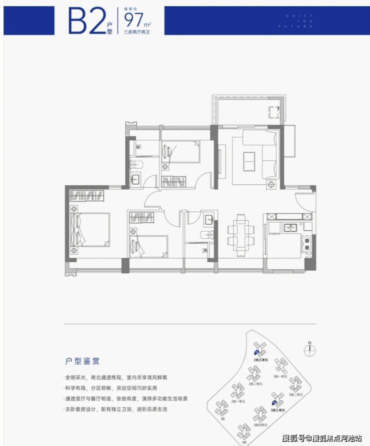 建面约99㎡3房是主力户型,朝向东北或东南方向,4栋朝向东南的远看高尔夫景观;
