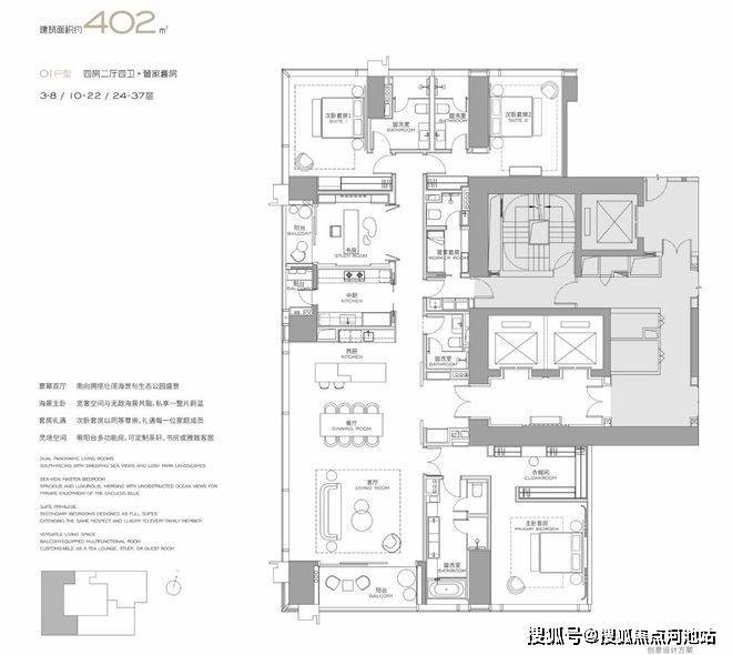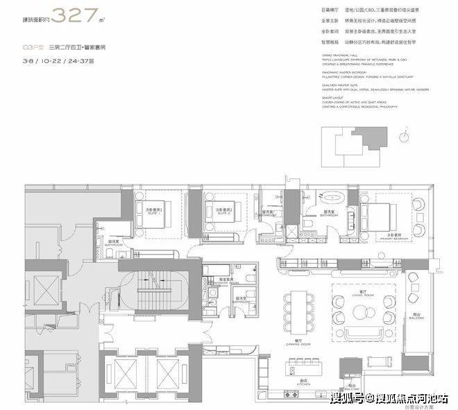 (3-57层)T3栋 四房四卫+家政套间。中西厨分区,餐客西厨一体,带多功能房。端头位置,三面采光。功能完备,房间数充足;实现了主仆双动线;会客观景视野一流。