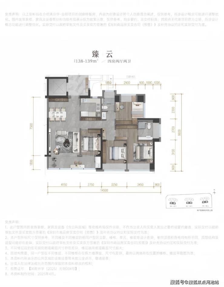 总规划420户,其中可售商品房套数待定,4梯4户,户户做到了独立专梯入户,地下室有3层,规划停车位661个,车位占比约1:1.5。