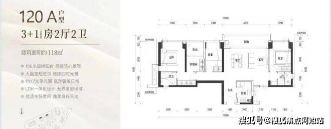 120㎡:客厅与卧室连通9.6㎡超大阳台,主卧带5.2㎡衣帽间,还有观景小阳台,主要为东南和西南朝向