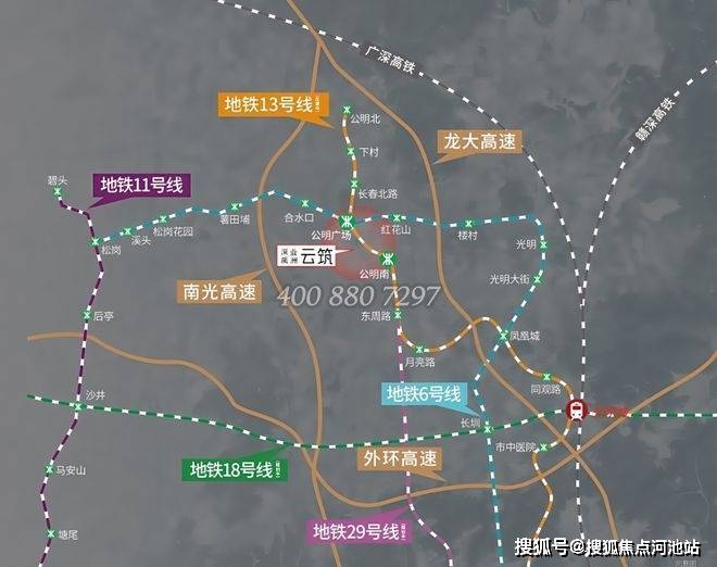 双高速:邻近龙大高速、南光高速两大城市动脉,畅达福田南山核心区双地铁:地铁6号线公明广场站约1.1km、13号线公明南站(在建)约700m,创享湾芯生活主干道:毗邻公明南环大道、松白路等主干道,高效通达全城。