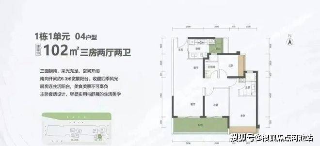102㎡的3房2厅2卫,1栋1单元02户型,设计的是经典竖厅格局,进门入户玄关,客厅3.5米开间,LDKB一体化设计,三开间朝南,动静分区,客厅连接次卧出6.3米长的巨幕大阳台,二字型厨房还带1个生活阳台,卫生间干湿分离,西南朝向。