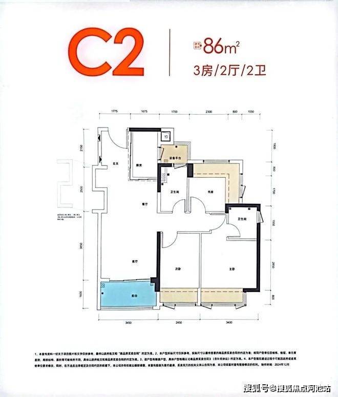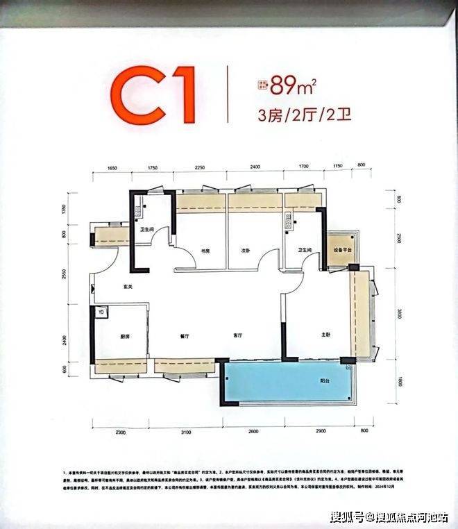 89㎡的3房2厅2卫,设计的是横厅南北通透格局,进门入户玄关,客餐厅5.7米开间,LDKB一体化,四开间朝南,3个卧室分别做到了主卧11.42㎡/次卧7.31㎡/次卧6.93㎡(实测面积,去掉墙体),主卧还带1个设备平台,主卧连接客厅出5.5米长的超大阳台,U型厨房,卫生间三段式分离,赠送面积高达20.09㎡,实际得房率约101%(包含赠送),西南/东南朝向。