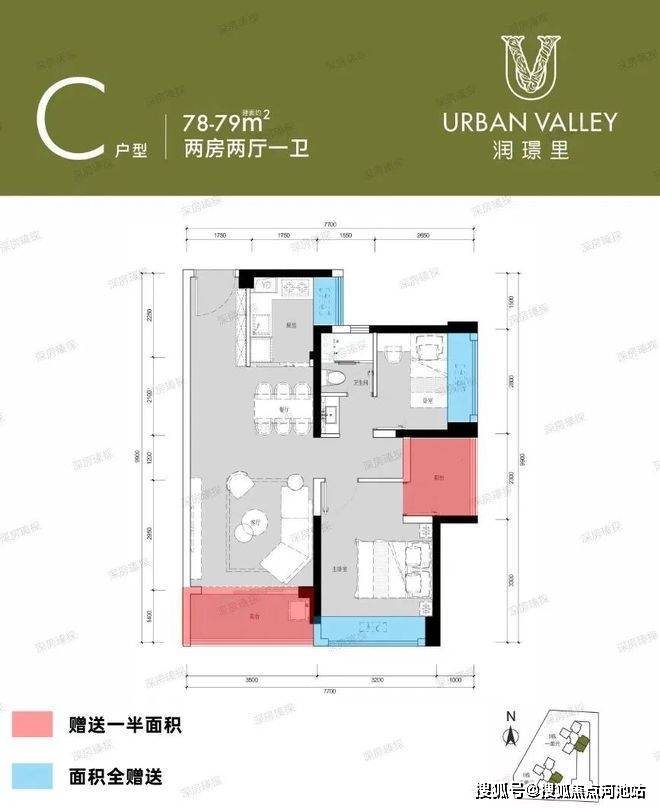 79㎡的3房2厅1卫,设计的是竖厅格局,LDKB客厅一体化设计,客厅3.5米开间,3个卧室分别做到了3.2米/2.8米/2.3米的宽度,U型厨房,卫生间三段式分离,得房率:74.44%(不含赠送),阳台都是东南朝向。