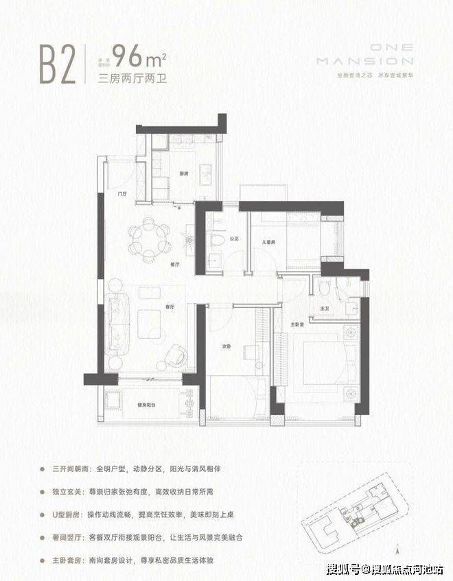 96㎡的3房2厅2卫,设计的经典竖厅格局,餐客厅一体化设计,三开间朝南,L型厨房,得房率72.47%(不含赠送),东南朝向。