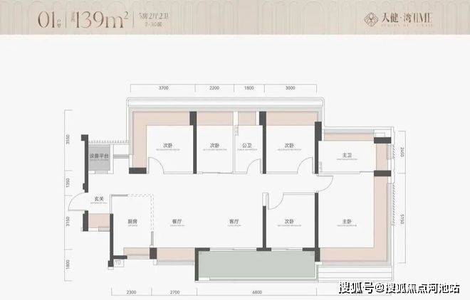 139㎡5房2卫,竖厅户型,朝南看海,户型结构和115接近,多了一间朝南卧室,主卫做了双面凸窗;