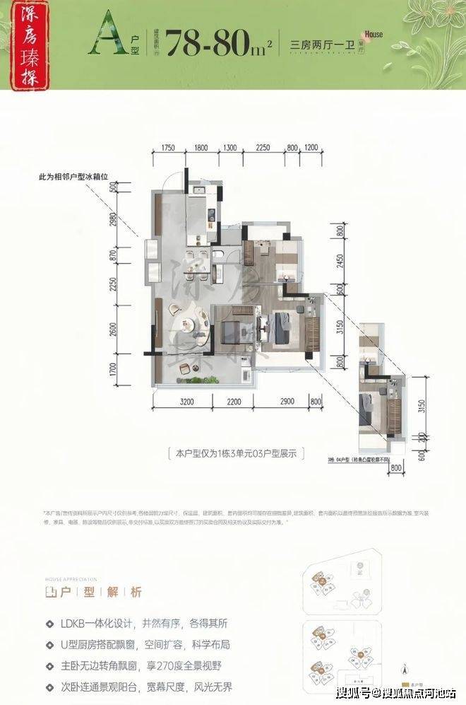 78-80㎡的3房2厅1卫,设计的是竖厅格局,客厅3.2米开间,LDKB一体化,S墙设计预留冰箱卡槽位,动静分区,主卧270无边转角飘窗,3个卧室分别做到了主卧16.62㎡/次卧9.27㎡/次卧5.72㎡(包含墙体飘窗),客厅连接次卧出5.4米长的大阳台,U型厨房,卫生间三段式分离,得房率约93-99%(包含赠送),西北朝向。