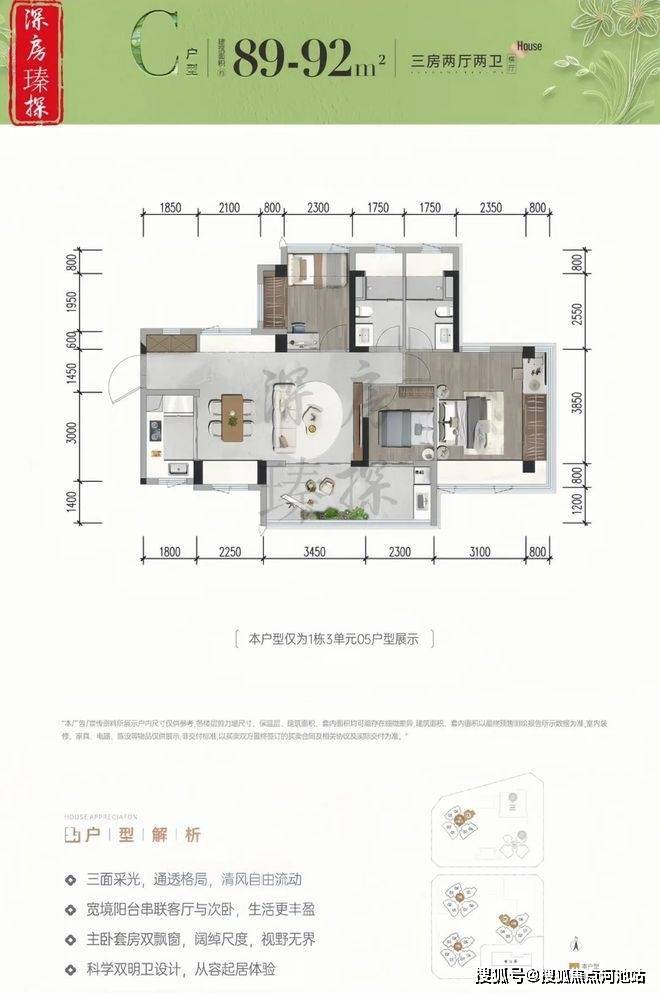 89㎡的3房2厅2卫,C户型,设计的是横厅南北通透格局,进门入户玄关,客餐厅5.7米开间,LDKB一体化设计,主卧套房双飘窗,3个卧室分别做到了主卧18.5㎡/次卧7.7㎡/次卧6.9㎡(包含墙体飘窗),客厅连接次卧出5.75米长的巨幕大阳台,U型厨房,科学双明卫,得房率约102-105%(包含赠送),阳台主朝东南向。