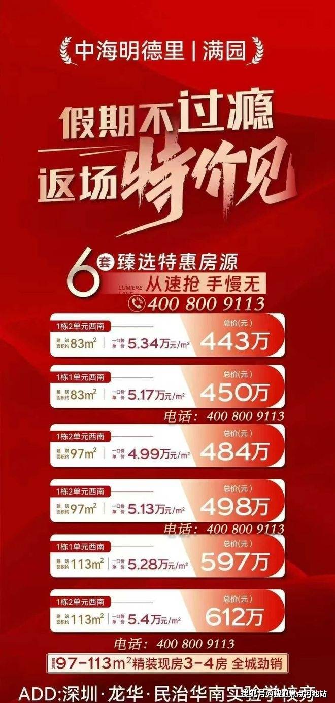 如需了解我们中海项目最新房价:备案价、近期折扣、学区、地铁、交通、户型图、特价房、优缺点、得房率、优惠活动、开盘时间、交房时间、周边配套、最新详情等情况,欢迎咨询中海明德里开发商售楼处电话:400-800-9113(已认证)中介请勿扰。