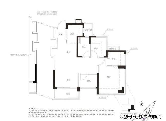84㎡的3房2厅2卫,设计的是横厅南北通透格局,客厅3.4米开间,LDKG+X空间一体化,动静分区,主卧南北通设计,餐厅位带1个设备平台,U型厨房,卫生间干湿分离,得房率:100%(包含赠送),阳台东北朝向。