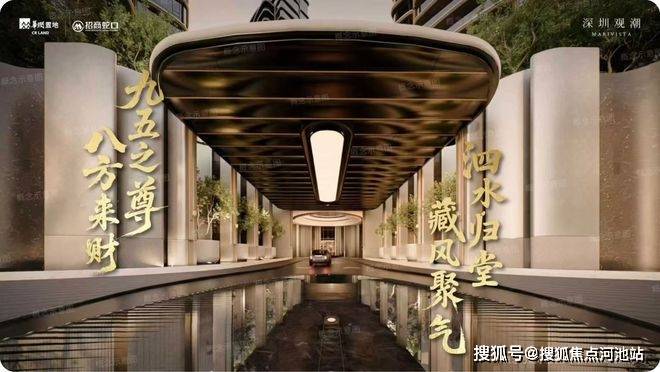 归家礼序:『深圳·观潮府』小区门楼在地块东侧,主入口设计了天圆地方穹顶的车马院和双水盘环岛落客区,环岛两侧通道设计了9米高的桅杆造型立柱和8株稀有乔木点缀,目之所及覆面用料多为名贵奢石,不管是寓意,还是奢感、仪式感都营造的非常到位,还充分考虑了风水局!