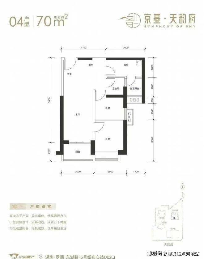 京基天韵府于今年3月23日已开盘!推出1栋B座244套,在售面积有70-85㎡的2房1卫,105㎡的3房2卫,120-150-180㎡的4房2卫户型,备案均价6.56万/㎡,备案单价5.99-7.62万/㎡,总价在453-1387万/套,开盘折扣为备案价85折,开盘当天销售138套,其中项目05-180㎡,06-85㎡及07-150㎡高层景观视野良好可以看到远处的梧桐山以及深圳水库景观,看湖总价最低在400多万。