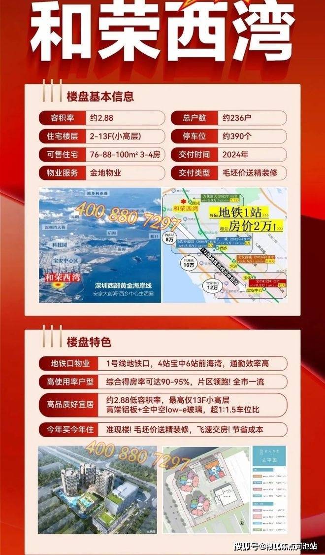 最新消息:深圳宝安西乡新楼盘——和荣西湾,现在清盘中,可以做0首付!地铁1号线固戍站200多米,总价327万起,在售建面约68-100平2-4房住宅,已经交房,精装修现楼,车位比1:1.66,容积率2.88,小高层(12-13层),小区全铝板外立面。