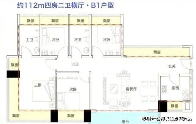 112㎡的4房2厅2卫(B1户型),设计的是横厅南北通透格局,进门入户玄关,餐客厅一体化设计,五开间朝南,全屋十面飘窗,主卧270°无柱转角飘窗,U型厨房,卫生间干湿分离,得房率约100%(包含赠送),客厅连接餐厅出大阳台西南朝向。