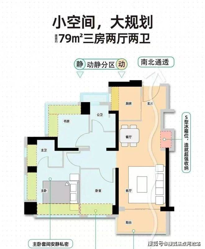 79㎡的3房2厅2卫,设计的是经典竖厅格局,客厅3.3米开间,LDKB一体化,S墙设计预留冰箱卡槽位,动静分区,三开间朝南,3个卧室分别做到了主卧12.1㎡/次卧7.36㎡/次卧6.67㎡(包含墙体飘窗),主卧+1个次卧270°飘窗设计,U型厨房,公卫三段式分离,得房率约88%(包含赠送),东南或西南朝向。