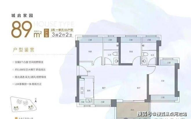 89㎡的3房2厅2卫,01.06户型,设计的是横厅南北通透格局,客餐厅6.12米开间,LDKB一体化,四开间朝南,主卧双飘窗南北通设计,3个卧室分别做到了主卧13.6㎡/次卧8.83㎡/次卧7.59㎡(包含墙体飘窗),L型厨房,卫生间干湿分离,得房率约91.14%(包含赠送),阳台主朝西南或东南向。