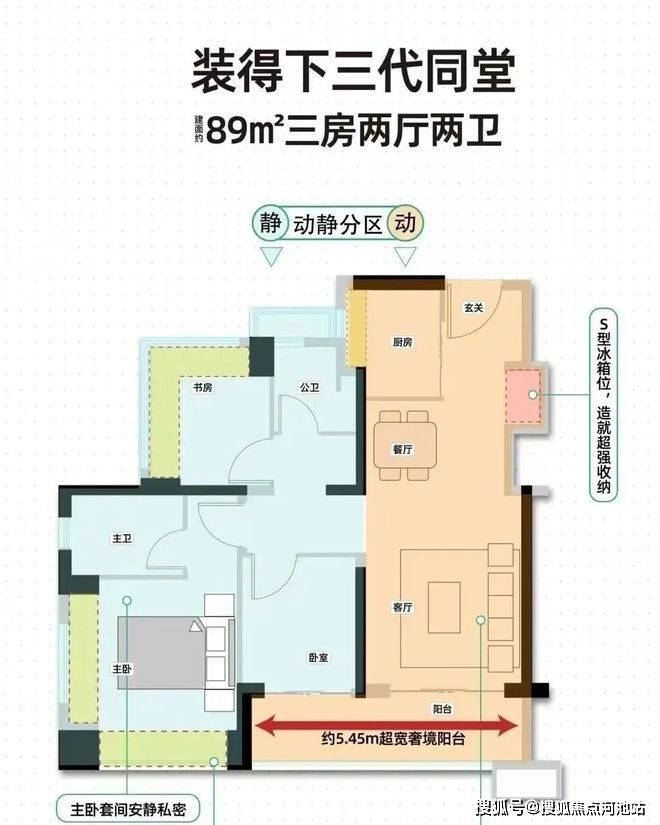 89㎡的3房2厅2卫,02.03户型,设计的是经典竖厅格局,客厅3.4米开间,LDKB一体化,S墙设计预留冰箱卡槽位,动静分区,三开间朝南,3个卧室分别做到了主卧13.79㎡/次卧7.62㎡/次卧6.93㎡(包含墙体飘窗),主卧+1个次卧270°飘窗设计,U型厨房,公卫三段式分离,客厅连接卧室出5.75米长的大阳台,得房率约87.2%(包含赠送),东南朝向。