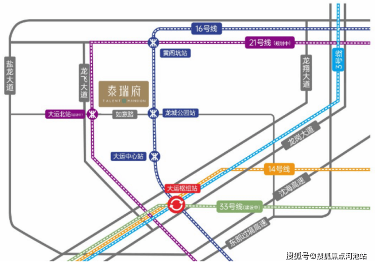 其中,大运枢纽作为东部唯一集城际、快线、普线于一体的交通枢纽,有3/14/16及33(在建中)号线交汇,未来可高效畅达深圳各区,并链接湾区各地。