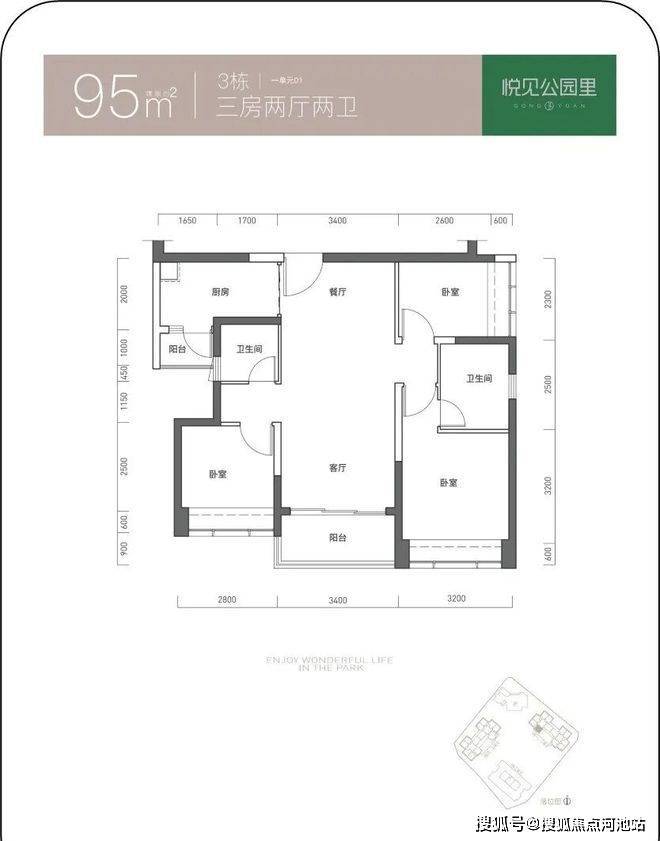 面积有85-88㎡的3房2厅1卫,91-94-95-97-110㎡的3房2厅2卫,120㎡的4房2厅2卫户型