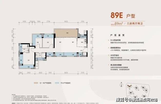 89㎡的3房2厅2卫,E户型,设计的是横厅南北通透格局,进门入户玄关,客餐厅5.6米开间,LDKB一体化设计,客餐厅出11㎡的大阳台,主卧+1个次卧双飘窗设计,全屋12面飘窗,3个卧室分别做到了主卧15.1㎡/次卧7.83㎡/次卧6.96㎡(包含墙体飘窗),L型灵动式厨房,卫生间干湿分离,得房率约:96.4%(包含赠送),阳台主朝西北或东北向。