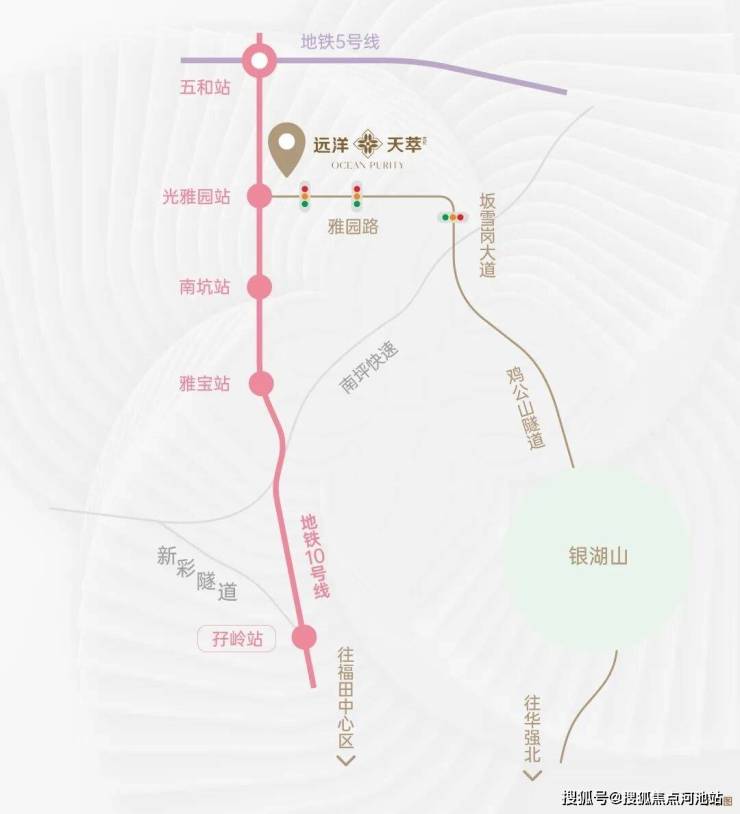 远洋天萃世纪雅园的交通配套以"地铁+城际"为核心,实现了与深圳主要区域的快速连接。项目紧邻地铁10号线光雅园站B出口,真正实现了"地铁口"的便捷出行。1站可到达五和枢纽站,换乘5号线(环中线)和深大城际(深圳地铁33号线),3站可直达深圳北站,3站到福田CBD,4站到南山科技园等核心区域。五和站是深圳少有的集2条地铁(5号线、10号线)和3条城际(深大城际、深惠城际、广深中轴城际)于一体的综合交通枢纽,预计2026年深大城际开通后,将实现更高效的跨区域通勤。