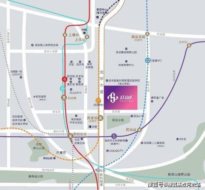 “1高铁、4地铁(含在建)、4站点”环绕,距离在建地铁27号线民宝站直线距离约200m,距离地铁5号线民治站900m,地铁4/6号线红山站1km内,其中深圳最繁忙地铁5号线享约112万人次/日客流,更有全国最大高铁枢纽—深圳北站加持,约7000万人次年吞吐量,汇聚八方客流。