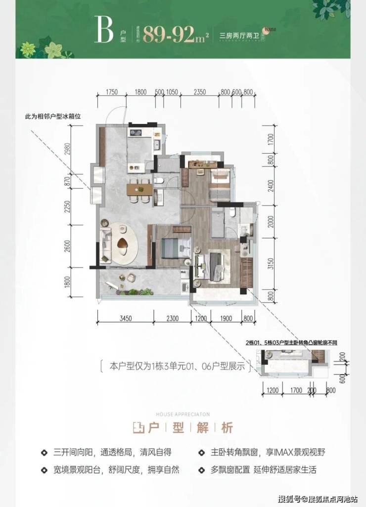 【建面89-92㎡3房2卫】