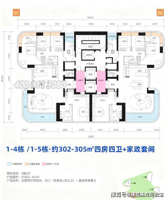 - D 栋:建面约 305㎡,层高 3.5 米,四房设计,共 80 套;