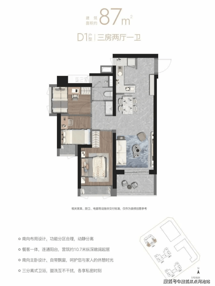 约87㎡3房2厅1卫,也有2种户型可选择,其中D1户型,10.7 m纵深餐客一体,朝东南向,通风采光不错。