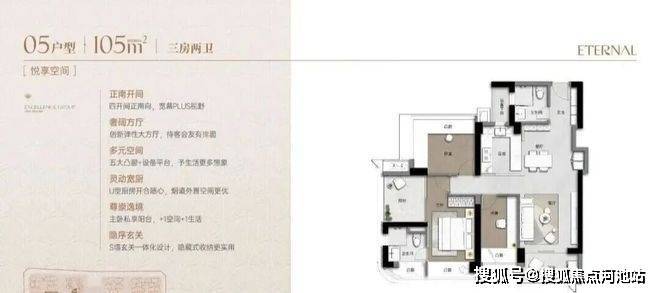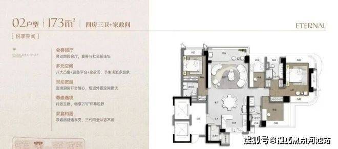 173m²的4房2厅3卫+家政间,设计的是竖厅类双龙抱珠格局,独立电梯厅入户约8.13㎡,客厅5.55米开间,LDKB一体化设计,主卧套房270°环幕凸窗+私享阳台,八大凸窗+设备平台+家政间,分别做到了主卧27.1㎡/次卧14.87㎡/次卧12.38㎡/次卧8.38㎡/家政间2.93㎡+阳台1.38㎡(实测面积,去掉墙体),U型厨房,公卫三段式干湿分离,得房率超90%(包含赠送),阳台9.56㎡正北朝向,看会展中心+市民广场。