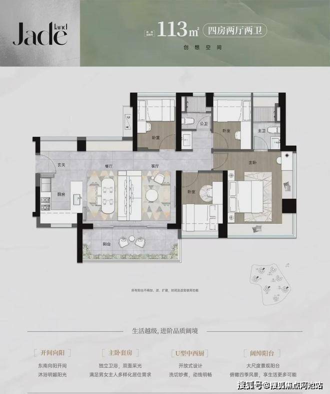 113㎡的4房2厅2卫,设计的是横厅南北通透格局,客餐厅5.65米开间,四开间朝南,全屋飘窗设计,4个卧室分别做到了3.2米/2.6米/2.45米/2.25米的宽度,主卧270度环幕视野,U型中西厨房,公卫三段式分离设计,得房率:76.54%(不含赠送),阳台主朝东南向。