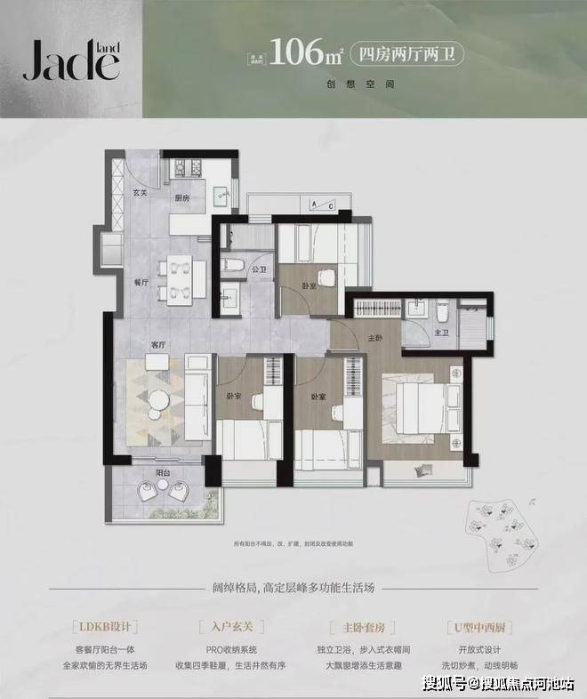 106㎡的4房2厅2卫,设计的是竖厅格局,客厅3.2米开间,LDKB一体化,S墙设计预留冰箱卡槽位,四开间朝南,4个卧室分别做到了3米/2.7米/2.25米/2.2米的宽度,U型厨房,公卫三段式分离设计,得房率:76.11%(不含赠送),有西南或东南朝向。