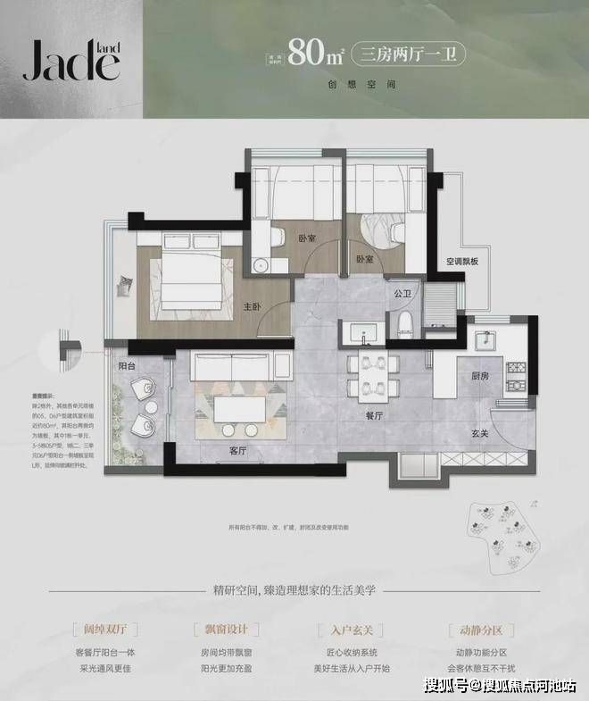 80㎡的3房2厅1卫,设计的是竖厅格局,客厅3.2米开间,LDKB一体化,S墙设计预留冰箱卡槽位,3个卧室分别做到了3米/2.4米/2.25米的宽度,U型厨房,卫生间三段式分离,得房率:76.54%(不含赠送),全部是西北朝向。