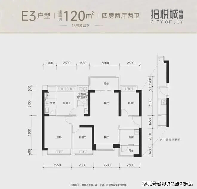 120平-140平,设计的是横厅南北通透格局,进门入户玄关,客餐厅6.3米开间,无过道设计,4个卧室分别做到了3.55米/3米/3米/2.8米的宽度,U型厨房,公卫三段式分离,得房率:74.31%(不含赠送),阳台1.8米宽度,主朝西南或东南向。