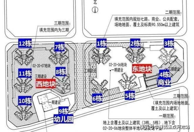 东区:占地约2.1万㎡,容积率5.28,包含住宅、商业、文化活动室、老年人日间照料中心和其他基础配套设施。1栋、2栋总高47F,3T6户;3栋、5栋总高32F,2T6户;6栋总高32F,2T5户;4栋属于商业,总高2层。