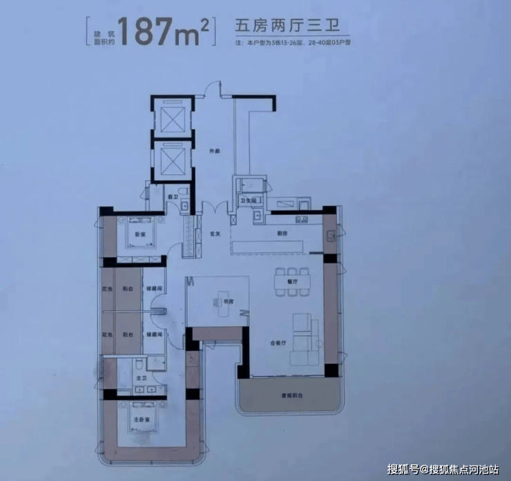 项目首推是3号楼102-111-127-129-146-187㎡,其中103-111户型只有13层以下才有,13层-40层是组合成了187㎡