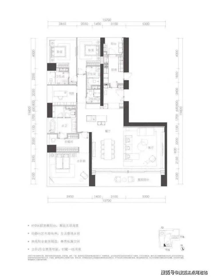 户型四套间设计,配备工人房,主佣分区,竖厅布局,约12m双厅进深,空间利用率很高。东端头位置,所有卧室都有开阔的景观,270°景观完全无遮挡。只存在T1B栋33-38层,仅6套。