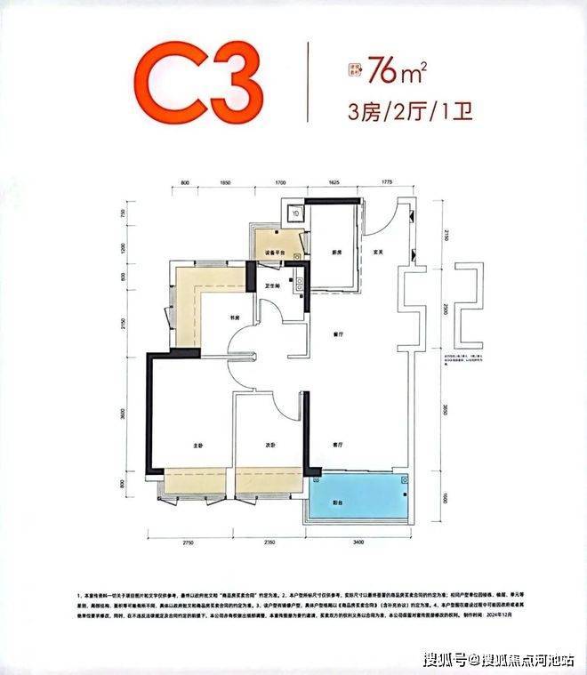 76㎡的3房2厅1卫,设计的是经典竖厅格局,客厅3.4米开间,LDKB一体化,S墙设计预留冰箱卡槽位,3个卧室分别做到了主卧10.99㎡/次卧7.3㎡/次卧5.91㎡(实测面积,去掉墙体),U型厨房,卫生间三段式分离,还带1个设备平台,赠送面积高达12.71㎡,实际得房率约97%(包含赠送),西南/东南或西北朝向。