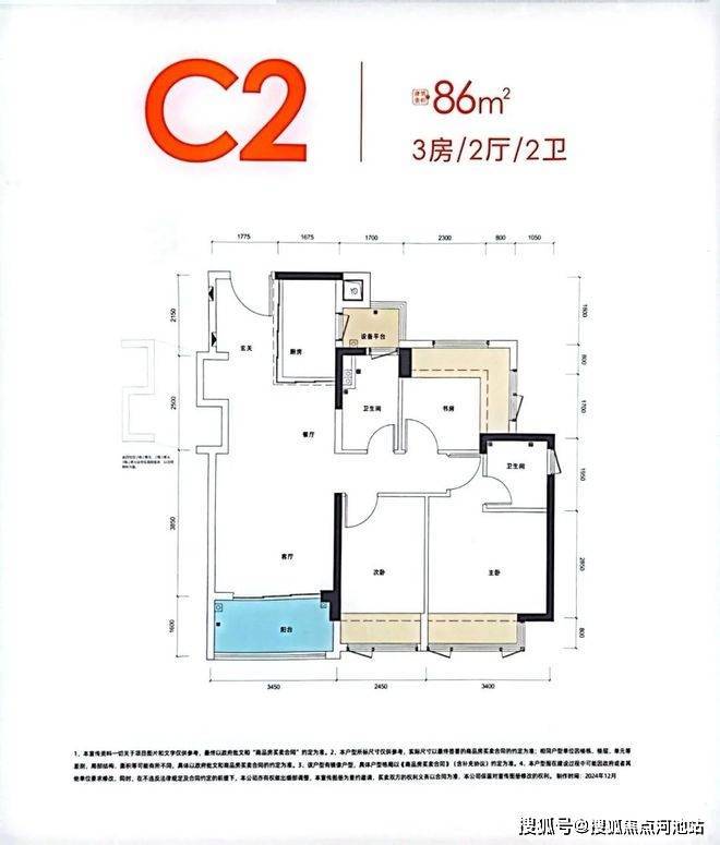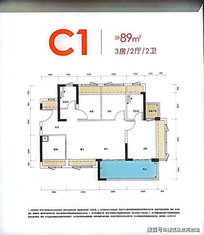 89㎡的3房2厅2卫,设计的是横厅南北通透格局,进门入户玄关,客餐厅5.7米开间,LDKB一体化,四开间朝南,3个卧室分别做到了主卧11.42㎡/次卧7.31㎡/次卧6.93㎡(实测面积,去掉墙体),主卧还带1个设备平台,主卧连接客厅出5.5米长的超大阳台,U型厨房,卫生间三段式分离,赠送面积高达20.09㎡,实际得房率约101%(包含赠送),西南/东南朝向。