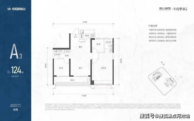 A3也是两条腿,分别是1-1栋04/05,主朝向是东南向,双龙抱珠格局。客厅拥有超大观景阳台,缺点是公卫是个暗卫,小次卧和主卫也对天井外走廊,采光不足。