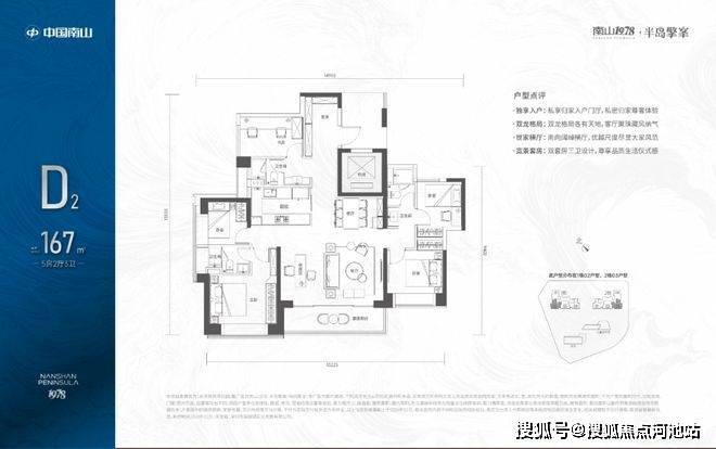 167㎡的5房2厅3卫,1栋02/2栋03高区户型,电梯入户送独立公区,设计的是竖厅双龙抱珠格局,四开间朝南,超宽敞客厅巨幕阳台,主卧大套间设计,U型厨房,双公卫三段式分离,得房率:72.07%(不含赠送),西南朝向。