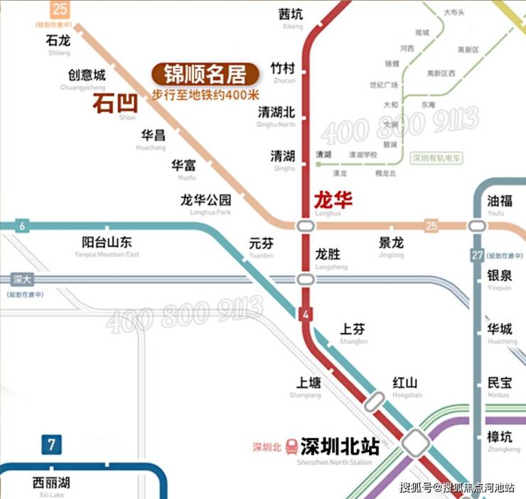 约400m地铁25号线石凹站(在建中,预计2028年运营通车),4站龙华中心/5站深大城际龙胜站/7站红山/8站深圳北站;临近6号线阳台山东站,4站深圳北,5站福田。