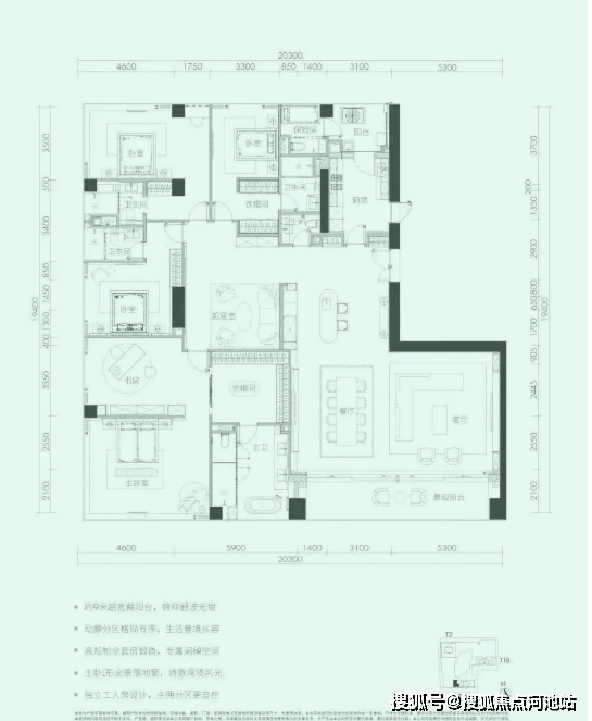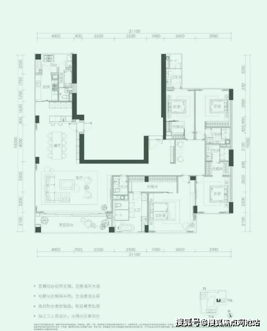 户型四套间设计,配备工人房,主佣分区,竖厅布局,约12m双厅进深,空间利用率很高。东端头位置,所有卧室都有开阔的景观,270°景观完全无遮挡。只存在T1B栋33-38层,仅6套。